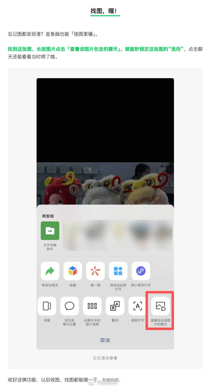 用户只需长按聊天中的图片,包含的聊天」,即可精准锁定这张图的「流向」,查看它正在哪些单聊或群聊中利用过。