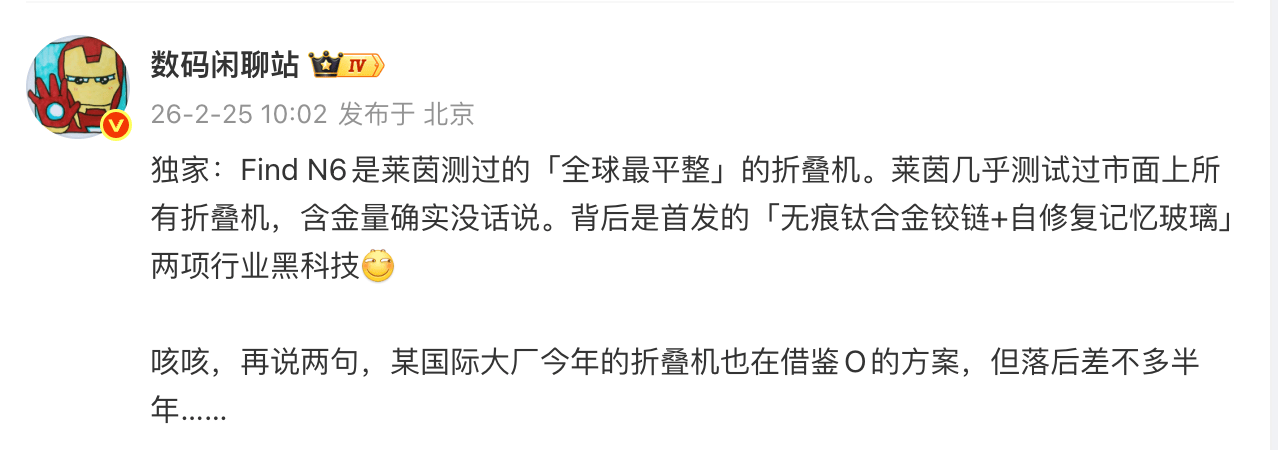 昨日,博从「数码闲聊坐」发文称,OPPO 新一代旗舰折叠屏手机 Find N6 或成为「全球最平整」的折叠机。(由莱茵测试)。