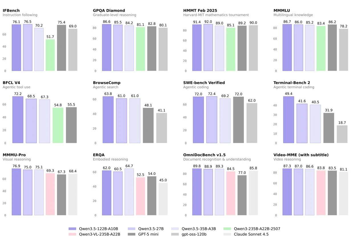 具体来看,Qwen3。5 采用夹杂留意力机制,连系高稀少的 MoE 架构立异,并基于更大规模的文本和视觉夹杂 Token 上锻炼,Qwen3。5-122B-A10B 取 Qwen3。5-35B-A3B 以更小的总参数和激活参数量,实现了更大的机能提拔。